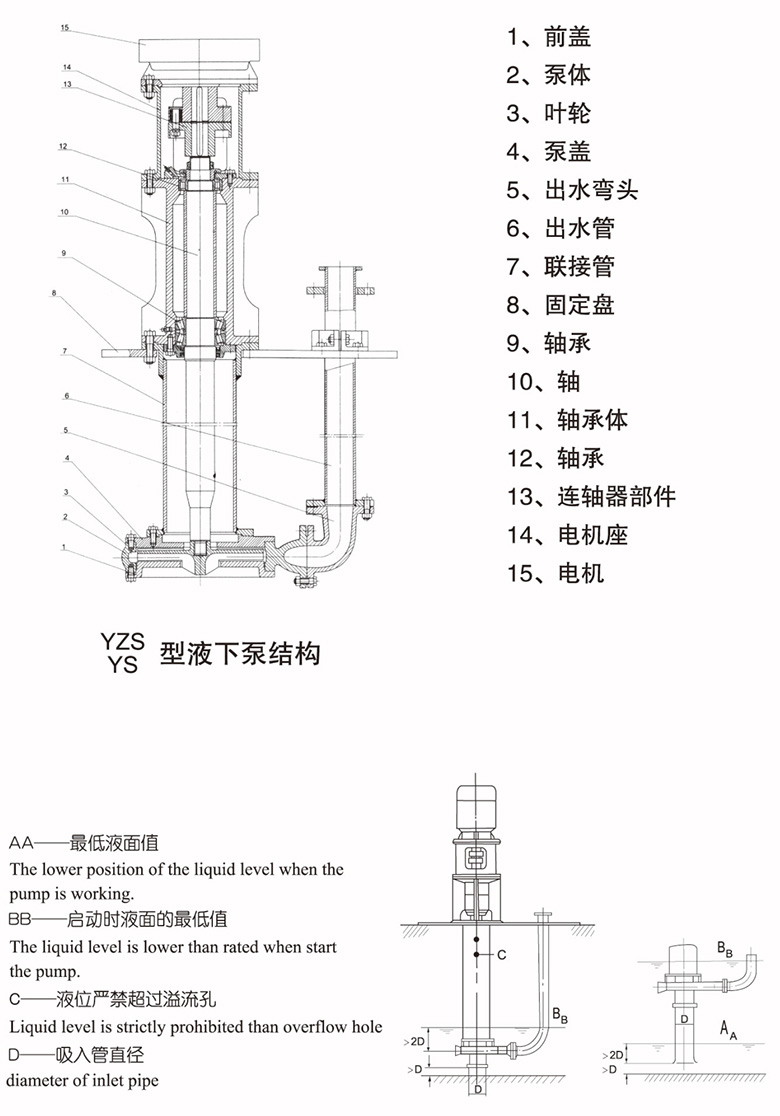 YS-YZS型泵為單級,單吸懸臂式結構,用軸承座,支承座,聯接管連接泵的水力部件,液體由出液管部件排出,泵的葉輪為半開式葉輪,在葉輪葉片進口延伸處設有攪拌葉片,該泵主要特點是在液下部位的泵軸,有足夠的剛度,葉輪,泵殼之間不設軸承,不采用軸封,可以輸送含有較大濃度固體顆粒的介質。泵插入液下長度在 800MM-3000MM之間,如果需要可以配帶吸入管。軸封采用液下泵插入液體中運行,不設軸封,傳動由立式電動機安裝在電機支承和支承座上,用聯軸器與泵相連。